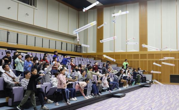 岡山県井原市教育委員会主催の「片山科学子ども教室」が10月26日、市内の芳井生涯学習センターで開かれ、児童や保護者ら約80人が参加。岡山理科大学・科学ボランティアセンターの学生たちが、さまざまな実験を披露し、子どもたちは科学の楽しさを体験しました。