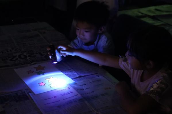 ライトで照らすと暗闇に絵が浮かび上がります