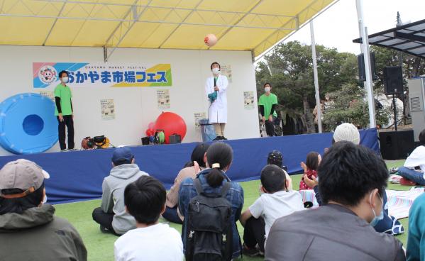 岡山市中央卸売市場のおかやま市場フェスが11月20日、同市南区市場で3年ぶりに開催され、岡山理科大学学生らのNPO法人ティラボが空気を使った科学実験ショーを披露。親子連れらを楽しませました。フェスではまた市場スタッフが、倉敷芸術科学大学学生がデザインした法被を初めて着用して運営に当たり、会場に彩を添えました。